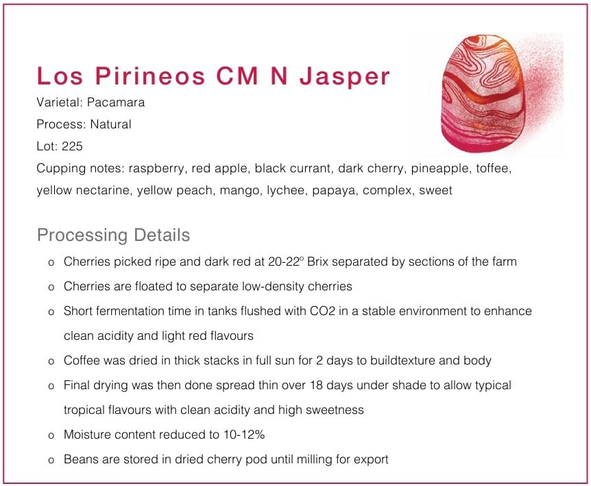 ロス・ピリネオスのチームと家族は、清潔な機器を維持し、初めから終わりまでの品質処理を確保するために大変気を使っています。また、処理、脱果、乾燥技術において最新の技術を取り入れています。2017年以来、プロジェクト・オリジンはロス・ピリネオスと協力し、カーボニックマセレーション処理を含むいくつかの実験的な処理技術を導入してきました。ロス・ピリネオスの農場には、テカパ火山を見下ろす人工の高原があり、さまざまな加工コーヒーの乾燥を可能にする広大な乾燥ベッドが広がっています。この高原のおかげで、乾燥する豆は一日中日光を浴びることができ、西風が均一で安定した乾燥を保証します。