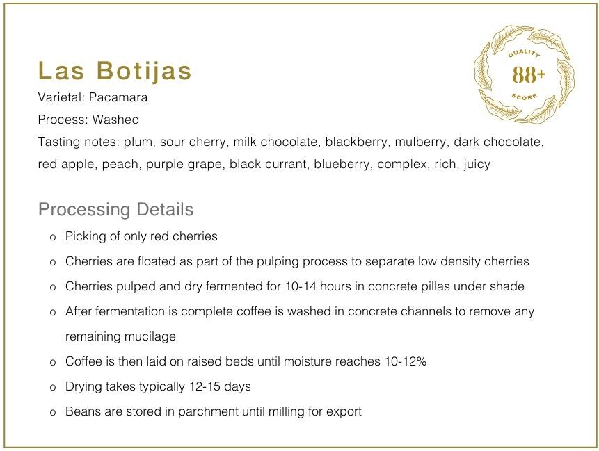 ラス・ボティハス農園は、地下に埋められた隠された宝に関する町の伝説にちなんで名付けられました。“ボティハス”とは、陶器製の胴体がふっくらした壺で、2つの開口部があり、湿気からお金を隠すために使われていました。後にこれらの壺は掘り起こされ、19世紀には楽器として使われるようになりました。ラス・ボティハスコーヒー農園は2011年にアベル・ジロンによって購入され、彼はこの木が実らせる大きなチェリーが好きだったため、パカマラという品種を植えることを選びました。何年も野菜を育てた後、アベルは現在コーヒーを栽培しながら、家族を支えるために運送の仕事も行っています。彼の最大の目標は、長男をより良い大学に送り、生命科学の勉強を完成させることです。プロジェクト・オリジンは、アベルが2016年にプロジェクト・オリジン・ホンジュラス レイトハーベストオークションで1位に輝いた年から、彼と協力を始めました。この受賞は非常に素晴らしい成果でした。